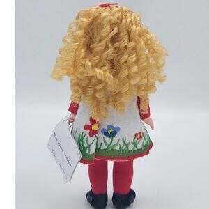 Itsy Bitsy Slider doll only produced in year 2004. She is so cute with blond ringlet curls and dark blue eyes that easily open and close. She wears a precious elaborately embroidered felt jumper over a long sleeve red unitard. Black side snap felt shoes complete her outfit. She has a red headband with a bow on top.