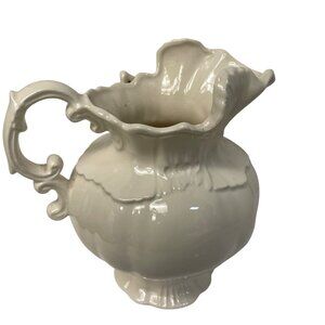 Vintage Ivory Ceramic Pitcher With Floral Accent Ornate Handle 8" x 8" Read