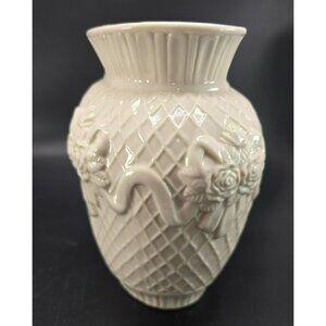 Vintage Ivory Ceramic Vase Embossed Floral Rose Basketweave Pattern JJ3900