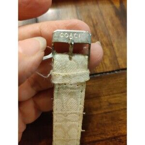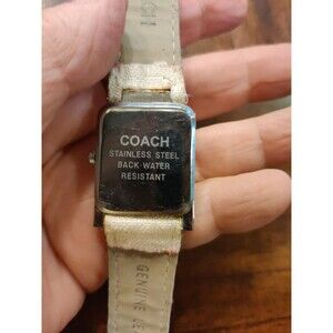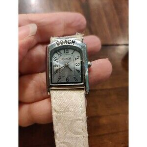 Not working. This Vintage Ivory Coach Buckle Watch features a classic design with a smooth silver bezel and an ivory fabric two-piece strap. The watch has a quartz movement and is splash-proof with a 12-hour dial and multiple hands. With a solid stainless steel case, push/pull crown, and a fixed polished silver case back, this luxury dress/formal watch is perfect for women looking for a timeless and elegant timepiece. However, please note that this particular watch is not currently working.