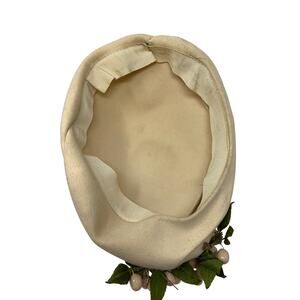 Vintage ivory felt cocktail hat featuring a softly sculpted mid-century silhouette with decorative faux berry cluster and green leaf trim accent at the crown. Elegant and feminine design with a smooth felt body and gently folded detail, typical of 1950s–1960s millinery styles. A beautiful statement piece for vintage collectors, special occasions, or period-inspired outfits. Unbranded with no maker label present.