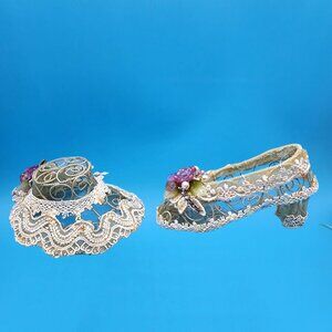 Vintage Ivory Lace Shoe & Hat Ornaments Pink Rose Rhinestone French Country Deco