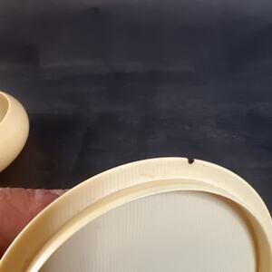 Elegant and collectible, this vintage ivory Py-Ra-Lin celluloid powder puff box dates to the 1930s Art Deco era. With its sculptural form and creamy finish, it’s a standout piece for vanity styling, perfume trays, or vintage beauty collections.