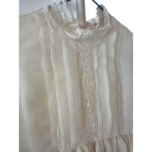 This elegant vintage ivory dress features intricate lace detailing, a high neckline, and sheer long sleeves. Its flowing skirt adds timeless sophistication and charm.
