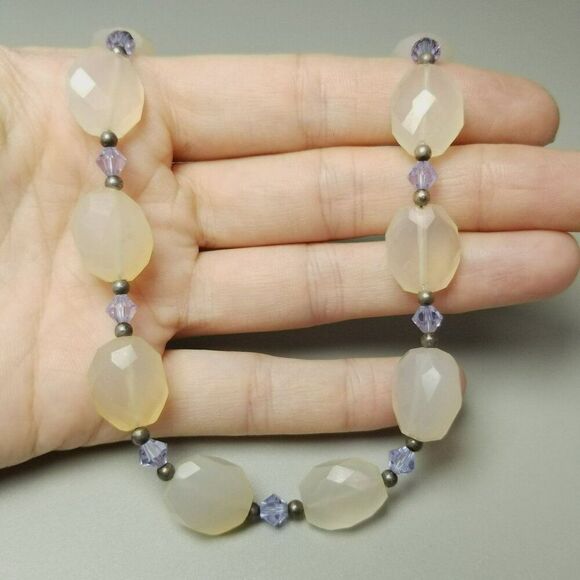 Vintage Ivory and Lavender Faceted Glass Beaded Necklace, Sterling Heart Clasp