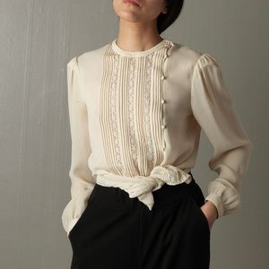 【Vintage】Vintage ivory, romantic blouse. Features front lace details. Lovely find. Fits S/M. Styled tied bottom. Minimal age wear, minor discolorations