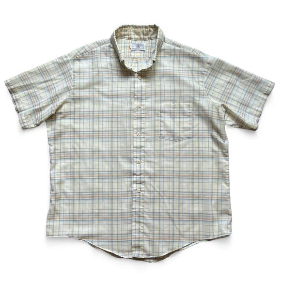 Vintage Ivy Classics Tan Blue Orange Plaid Button Down Short Sleeve Shirt XL USA