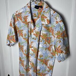 Very good vintage condition - no snags, holes, or stains. Blue and orange Hawaiian floral print allover. Short sleeve relaxed fit. Button down style with a collar. 100% cotton fabric and made in Pakistan. Machine washable. Smoke free pet friendly home. All offers are welcome.