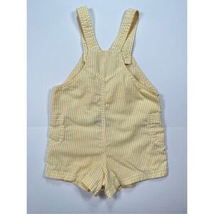 Lightweight, breathable fabric with a yellow and white vertical stripe pattern. It has a traditional overall style with adjustable shoulder straps that fasten in the front using white buttons.