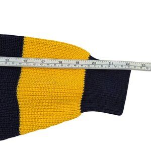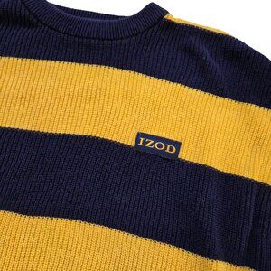 This vintage IZOD cotton sweater features bold navy and yellow rugby stripes in a thick rib-knit design. Made in Turkey, this 90s inspired classic has a relaxed, slightly boxy fit and iconic preppy style. Perfect for fall layering, varsity-inspired outfits, or retro streetwear looks.