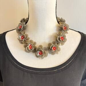 Vintage J. Crew Gray Lucite Flower Necklace Red Accents Dimensional 3D Statement