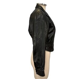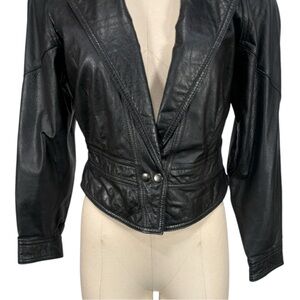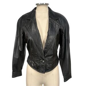 Features: 100% leather outer. Lined inner. V neckline. Fitted Waist line. Notch lapel collar. Long dolman bat wing style sleeves. Lightly padded shoulders. double snap bottom closure.