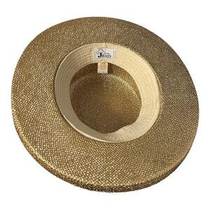 This vintage gold-tone woven hat by J Hats adds instant shine and retro flair to any outfit. Made in Mexico, it features a structured boater-style crown, matching metallic band with black-and-gold crest detail, and a comfortable fabric inner band. A unique statement piece that captures vintage charm and elegance.