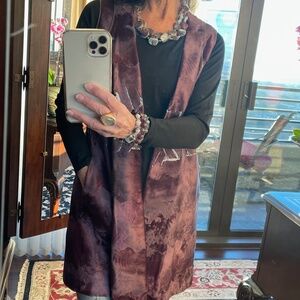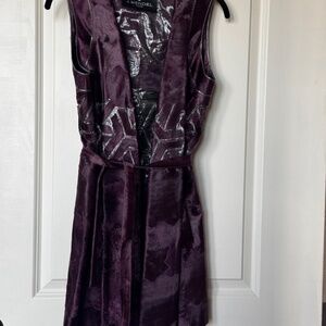 Aubergine J. Mendel open front fur vest with dual slit pockets at sides and laser cut accents throughout. Fabric and Size tags are missing, so please go by measurements. Based on how it fits me I estimate it to be an XS. Beautiful Vintage condition. Measures approx: bust 31", waist 32" length 37". I am not an expert but believe this to be Sheared Persian Lamb fur.