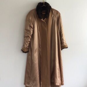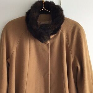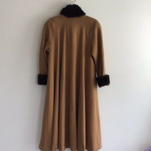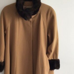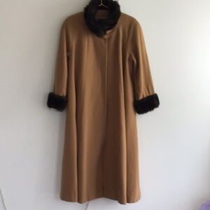 Vintage J Percy for Marvin Richards lambswool coat with fur trim. Size 12. Please see measurements. Gorgeous on trend swing style coat. Raglan sleeves. Inseam pockets. Fully lined. A few flaws probably moths as shown in photos. No rips or stains in shell or lining. Just a wonderful piece.