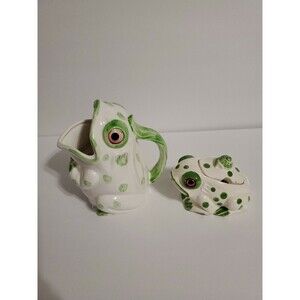 Vintage J S N Y Ceramic Frog Creamer & Lidded Sugar Bowl Japan Nice. Condition is Used. Some wear with tiny chip in lid. See photos. Condition: Pre-Owned - Vintage 1973 Green White Frog Creamer & Lidded Sugar Bowl . J.S.N.Y JS NY FS. Made in Japan.