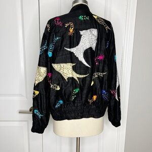Vintage JA Resort Embroidered Black Silk Bomber Jacket Fish Sequins Sz Medium