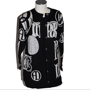 Beautiful and warm cardigan sweater from Jaeger. Wool material. Color black with white and silver pattern / accents. Size small.