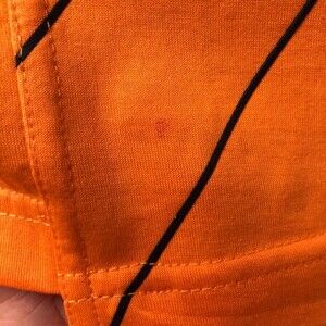 1-bright true orange sleeveless medium with v-neck collared embrodiered stripe approximately 23.5 inches long x 21.5 inches pit to pit. There is a faint spot on back -see pic - it may come out in wash just wanted to share.