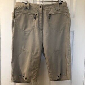 Vintage JAMIE SADOCK Women's Beige Bermuda Shorts Golf Apparel Size 10. Shorts are pre-owned vintage (pre-2004). Please see all photos for visible condition. Grommet decoration at bottom. 2 pockets with zip fron 2 lower pockets. Approximately 23 inches top to bottom, 13 inch inseam, rise 11 inches. 85% polyester 15% nylon. Fabric has a soft feel to it. Very nice looking neutral colored shorts that could be worn with any top. More of a beige but some may call it tan.
