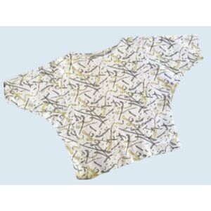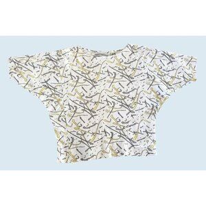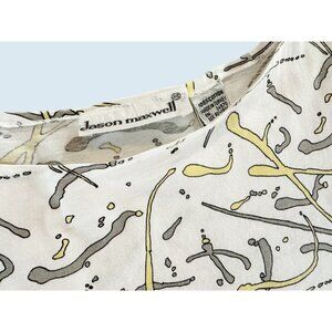 Very cool vintage top by Jason Maxwell. Circa 80s / 90s.. Pullover style. Dolman sleeves. Slightly cropped. White with yellow and grey print allover. 100% cotton. Asymmetrical stitching. Pre-owned and gently worn in really nice condition!