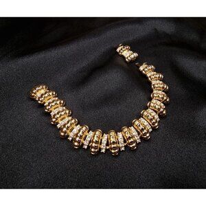 Crafted in radiant gold-tone metal, the bracelet features boldly ribbed barrel-like links, each separated by rows of clear, sparkling rhinestones. These dazzling accents mimic the look of fine diamonds, capturing the glamour Jackie Kennedy so effortlessly embodied at White House galas, diplomatic dinners, and state visits.