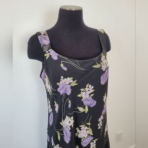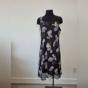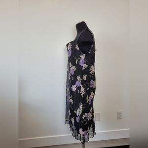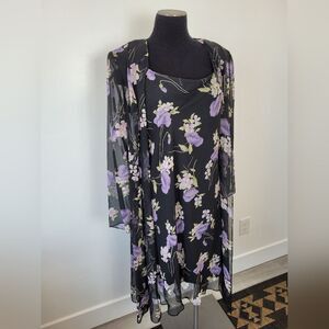 Beautiful vintage set in a gorgeous black and purple floral print. Set includes a totally sheer kimono style Topper with shoulder pads and long sleeves. The dress is a midi length A-line cut with a flattering slightly fitted bodice and scoop neckline. The dress is fully lined with a Flutter hem, pullover closure. Excellent condition, freshly dry cleaned. Size 12, measurements are approximately 42 inches long 20 inches underarm to underarm laid flat for the jacket 40 inches long 20 inches underarm to underarm laid flat for the dress.