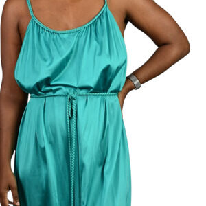 Vintage JC Penney nightgown FEATURES a vivid teal color and grecian goddess style. Braided neckline. Open sides. Sleeveless. Braided belt at the waist. Long maxi length. Made in USA.