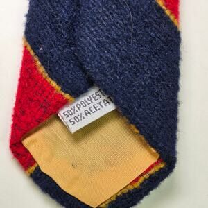 Channel bold vintage prep with this classic JC Penney wide repp tie featuring red and navy diagonal stripes trimmed in gold. Made from a textured polyester-acetate blend, this retro statement piece is perfect for 70s Ivy League and heritage-inspired styling. Great for pairing with blazers, cardigans, or layered fall looks.
