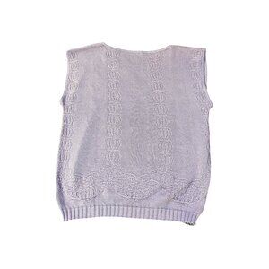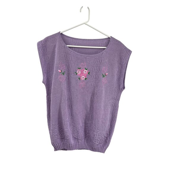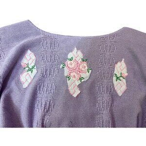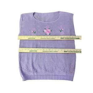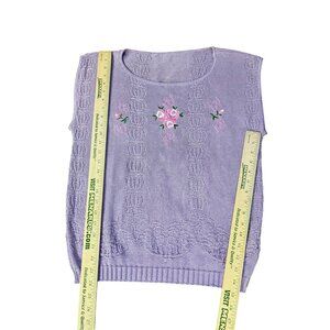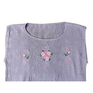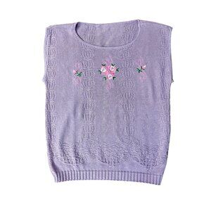 Lovely vintage sleeveless sweater featuring delicate pink embroidered roses on soft lavender purple knit. Classic 80s/90s style with a slightly boxy fit.