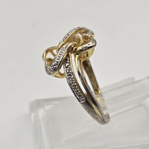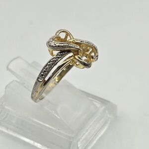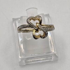 This beautiful ring is designed by the vintage company JCM. This two-tone gold / silver ring features a double-heart design. The hearts are intertwined, and 9n each side of the ring band appears to be paved with small diamonds. JCM is known as Jacmel Jewelery Inc. Jacmel Jewelry, Inc. was founded in 1977 in New York City. Has manufactured jewelry for companies such as Disney, Nickelodeon, DC Comics, Hallmark, Sanrio, NFL, MLB, and other jewelry designers. Works primarily in gold and silver.