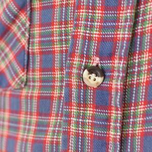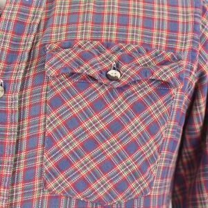 Vintage blue and red plaid button down shirt. The front features two buttoned chest pockets with a cool small wave shaped detail flap. Shirt has a fitted cut. Made from soft and lightweight cotton fabric.