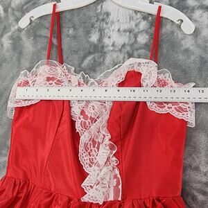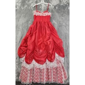 Vintage JCPenney Prom Dress Womens XS Red White Satin Lace Southern Belle Gown Layered Ruched Spaghetti Strap Sweetheart Whimsy Floor Length Formal Victorian Renaissance Party 80s 90s Gothic Punk EMO Grunge