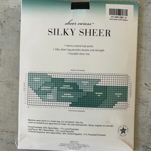 vintage JCPenney Sheer Caress Silky Sheer pantyhose in a classic navy blue. This pair is new in its original packaging and features a satiny control top, silky sheer legs, and a durable sheer toe. The Queen Tall size provides a comfortable and flattering fit. These pantyhose are a perfect addition to any vintage-inspired wardrobe