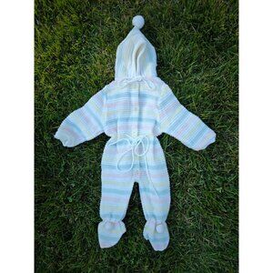 This vintage infant coverall, crafted by JCPenney, features pastel stripes and a charming hood with pom-poms. Made from soft acrylic, it ensures comfort and warmth.