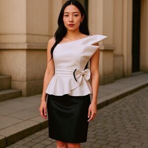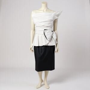 This exquisite vintage white satin peplum top is pure elegance from JCPenney's classic collection. The luxurious ivory satin fabric has a beautiful sheen that photographs gorgeously and feels incredible against the skin. The sophisticated off-shoulder design with delicate spaghetti straps creates a timeless romantic silhouette. The standout feature is the stunning oversized bow with sparkling rhinestone center detail that catches light beautifully. The fitted bodice with elegant ruching at the waist creates an incredibly flattering hourglass shape, while the structured peplum hem adds feminine sophistication. Quality vintage construction with smooth lining ensures this piece has maintained its beauty through the years. Perfect for vintage enthusiasts, bridal events, cocktail parties, or special occasions. Size 9/10 fits true to vintage sizing.