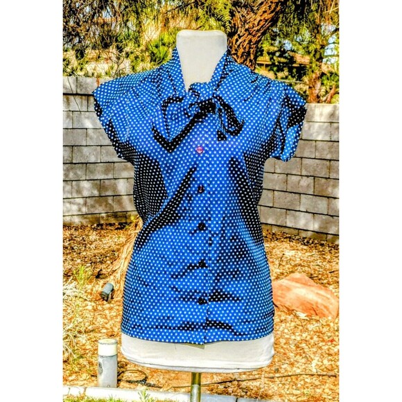 Vintage JCPenny Women's Med Polka Dot Ribbon Accent V-Neck Button-Up EUC