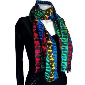 Oblong-shaped scarf measures approximately 60" Long x 13" Wide.