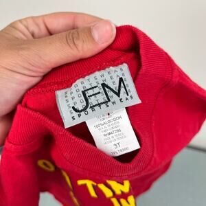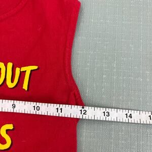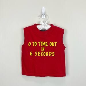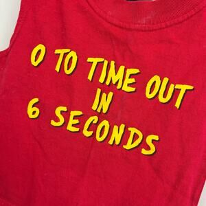 Vintage JEM Sportswear Time Out Tank Top. Toddler boy size 3T. Sleeveless red shirt with yellow "0 to time out in 6 seconds" across the chest. Light mark at neck (see last photo; untreated). Perfect for your little troublemaker!