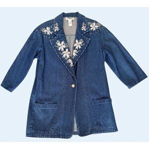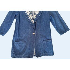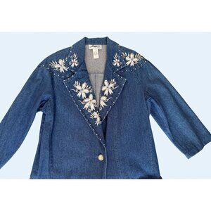 Cool vintage denim blazer / jacket. Circa 80s / 90s. Oversized fit. Floral embroidery with rhinestone and stud embellishments. Single decorative button closure. Front patch pockets. 100% cotton. Size medium. Pre-owned and gently worn in really nice condition!