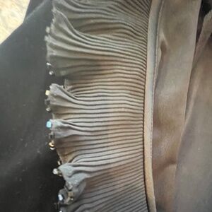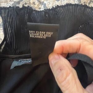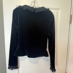 This Vintage 90’s JESSICA HOWARD EVENING Black Velvet top has a Surplice neckline with sheer ruffled beaded trim. Long sleeves, the cuff has a ruffle with beading. Side ruching where the neckline crosses over. Back zipper. Size 12. EUC
