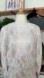 This beautiful dress has a dainty mesh white floral lace shell and a solid satin nude beige lining. She has a round neck with embroidered lace collar, long sleeves, and dropped waist. The skirt is long and relaxed with a scalloped hemline.