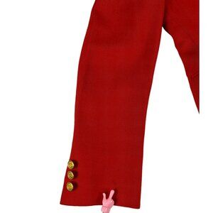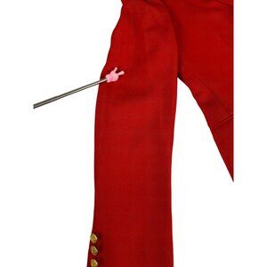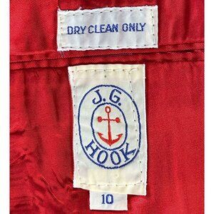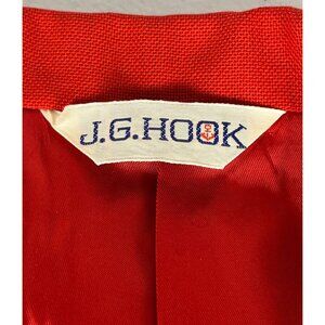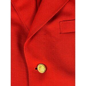 Make a bold statement with this Vintage JG Hook Blazer Jacket Coat in Women's size 10. Crafted in a striking red hue, this blazer is adorned with elegant gold anchor buttons, embodying a chic nautical theme. It features two front pockets for added practicality and a classic collared design that enhances its timeless appeal. The tailored fit and structured silhouette make it perfect for both casual outings and polished office looks. Pair it with trousers or a skirt for a stylish outfit that effortlessly blends vintage charm with modern sophistication.