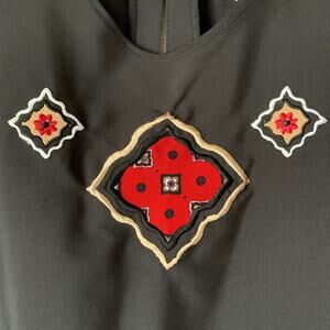 Vintage black blouse with embroidered diamonds by JG by Joyce Petite. This short-sleeved blouse is made with a silky material. The front has 3 diamonds made with beige, black, and white embroidery lines. The center diamond has a handkerchief pattern material in the center and the side diamonds an embroidered flower. It has a round, slightly scooped neckline with a button and loop closure in the back that make a slit keyhole. It is pre-owned and in great condition.