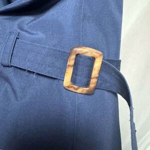 Beautiful, vintage, Navy blue trench coat with teal accents and tortoise shell buckles at waist and cuffs and tortoise shell buttons. Excellent condition other than small white paint? stain on inside of collar (not noticeable when worn. Size on tag is 13/14. Please see measurements below for fit. All measurements taken lying flat.