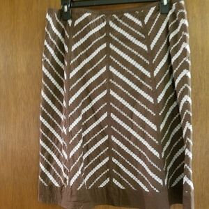 Brown with white embroidered chevrons, A-line, fully lined, invisible side zipper, 25" long