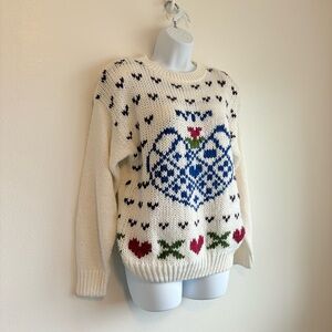 Vintage JJ Fargo hand-knitted sweater, known for unique and intricate designs popular in the 80s and 90s. This JJ Fargo sweater in hand knit with a fair Isle heart and flower pattern. Hand-knitted construction features the "Knitted by Hand" tag. Vintage aesthetic: Reflecting styles from the 70s and 80s, made from blends of ramie and acrylic. Vintage Granny-core Eclectic Grandpa Fair Isle