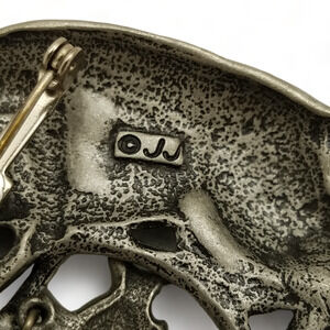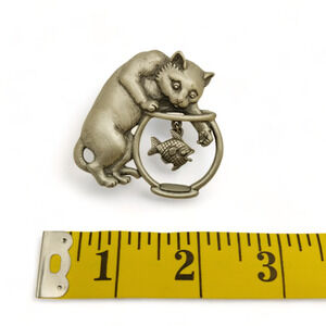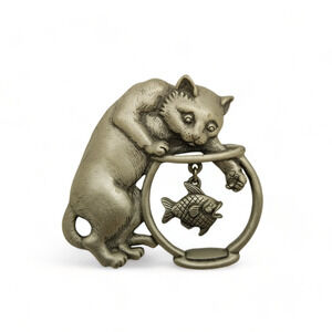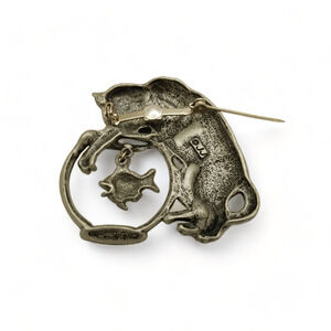 Vintage JJ Jonette Brooch Pewter Cat Fishing In Bowl Dangling Fish Signed