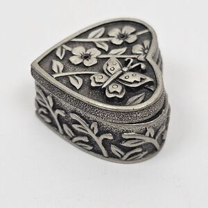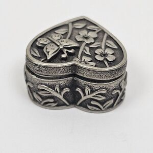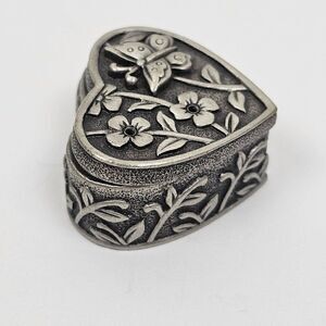 Vintage JJ Jonette Floral Heart Butterfly Lid Brooch Pin Trinket Small Jewelry Box Pewter
