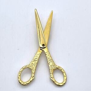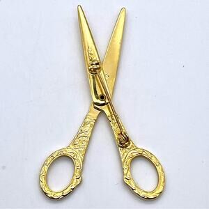 • Vintage 1980's JJ Jonette articulated gold-tone brooch pin shaped like scissors with ornate details on handles - SIGNED